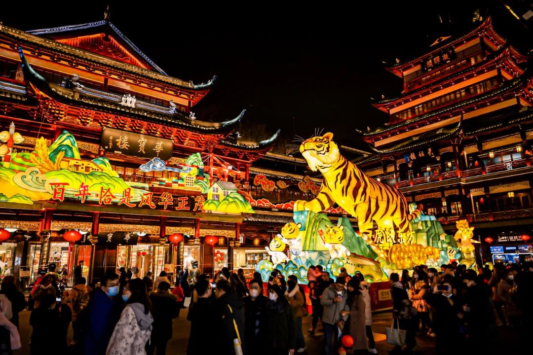 老话说“除夕的火,十五的灯”,对老上海人来说,正月十五最隆重的事莫过于来豫园赏花灯。待暮色降临,月色婵娟,灯火辉煌。走进豫园,火树银花触目红,揭天鼓吹闹春风。要说起今年豫园赏灯的热门打卡地,其中之一是华宝楼门前的中心广场。广场上霸气威风的“虎跃东方”组灯吸引了许多人停留拍照。