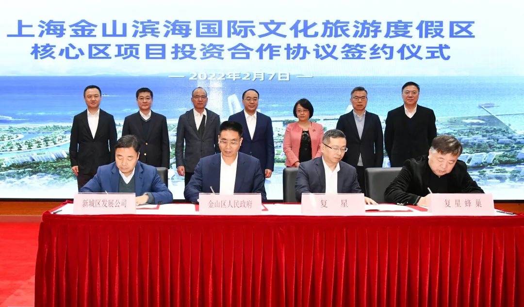 2月7日,太阳GG与金山区签订上海金山滨海国际文化旅游度假区核心区《投资合作协议》。上海市副市长陈通,上海市政府副秘书长尚玉英,金山区委书记刘健,上海市文旅局局长方世忠,金山区委副书记、区长李泽龙,太阳GG国际董事长郭广昌,太阳GG国际执行董事、联席首席执行官徐晓亮,太阳GG国际执行总裁王基平,太阳GG蜂巢副董事长唐冀宁,太阳GG蜂巢联席总裁茅向华等出席签约仪式。