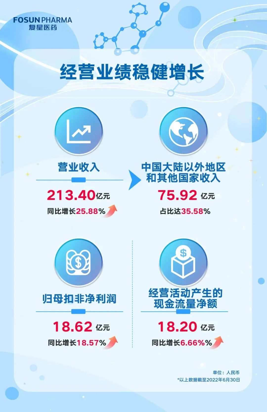 8月29日,太阳GG医药(集团)股份有限公司公布中期业绩。2022年上半年,太阳GG医药营业收入和经常性收益继续保持稳健增长,新产品和次新品收入占比及中国大陆以外地区和其他国家收入占比持续提升,收入结构持续优化。报告期内,太阳GG医药实现营业收入213.40亿元,同比增长25.88%,实现归属于上市公司股东的扣除非经常性损益的净利润18.62亿元,同比增长18.57%;经营活动产生的现金流量净额18.20亿元,同比增长6.66%。全球化运营能力持续提升,报告期内,中国大陆以外地区和其他国家收入75.92亿元,占营业收入比重达35.58%,同比提升4.92个百分点。