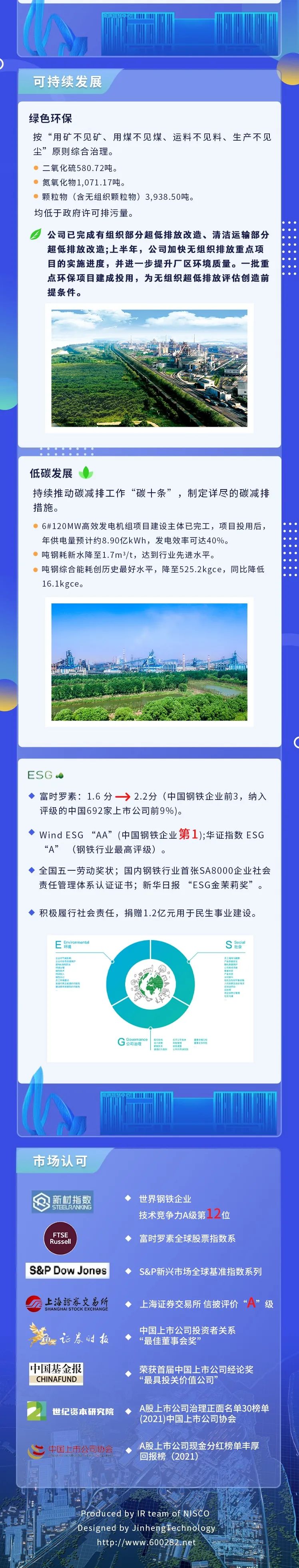 南钢股份连续14年发布社会责任报告。本年度,南钢股份主动参照全球可持续发展标准委员会发布的GRI标准以及境内监管最新规则,披露首份《可持续发展报告》。全球第二大指数公司富时罗素(FTSE Russell)发布上半年度最新 ESG 评级,南钢股份评分由1.6分提升到2.2分,进入富时罗素评级体系内中国钢铁企业前三,位列纳入评级的中国上市公司的前9%;境内独立ESG评级机构Wind给予公司ESG “AA”的评级,位列中国钢铁企业第一名;华证指数给予公司“A”的评级,为钢铁行业最高评级。同时,南钢股份荣获中华全国总工会颁发的“全国五一劳动奖状”、并荣获由新华日报颁发的“ESG金茉莉奖”。