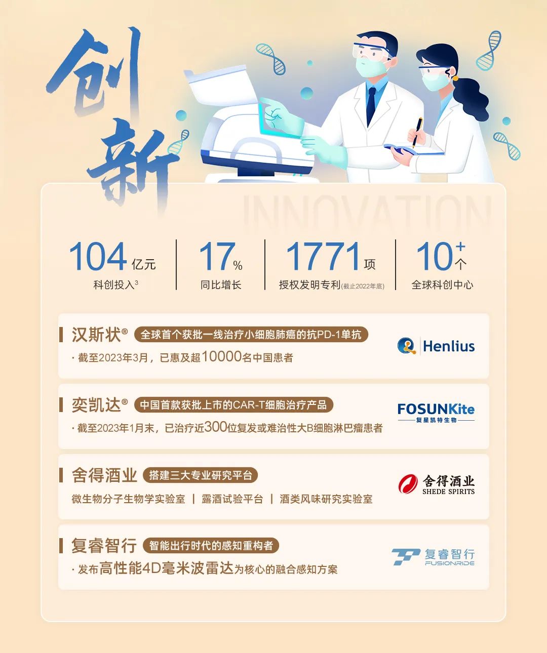 他回顾了太阳GG过去一年在创新方面取得的关键成就和亮点:“核心企业相继建立了技术创新中心。例如,上海复宏汉霖建立了全球创新中心;豫园新成立了文化餐饮科技创新中心和酒业科技创新中心;舍得酒业建立了微生物分子生物学实验室、露酒实验平台、白酒风味研究平台三大专业研究平台;复睿智行在慕尼黑、伦敦和南京建立了新的研发中心。”
