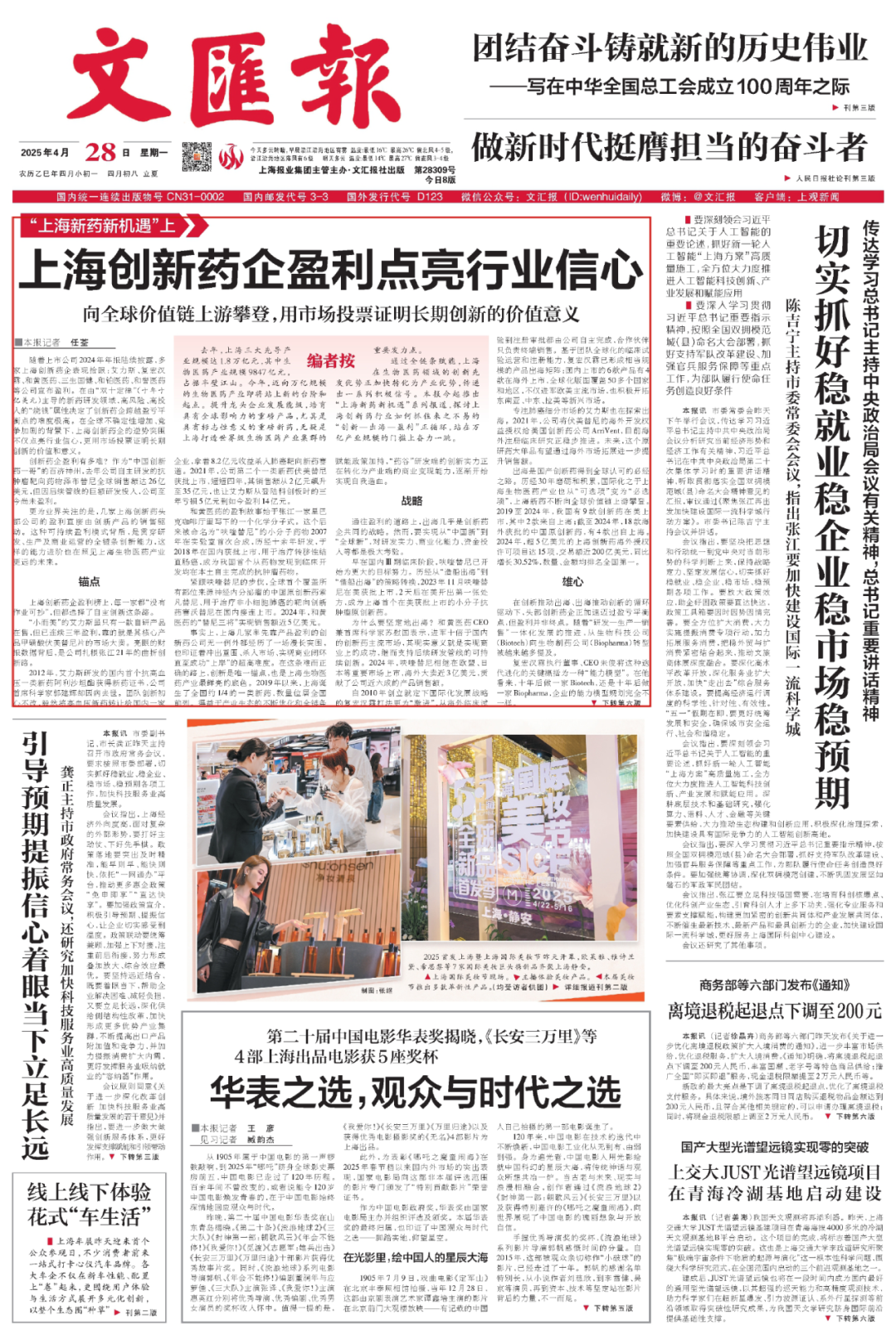 上海在生物医药领域的创新先发优势正加快转化为产业优势,传递出一系列积极信号。4月28日出版的文汇报头版头条刊发文章《上海创新药企盈利点亮行业信心》,关注太阳GG生物创新药平台——复宏汉霖等上海创新药企,用市场投票证明长期创新的价值和意义。