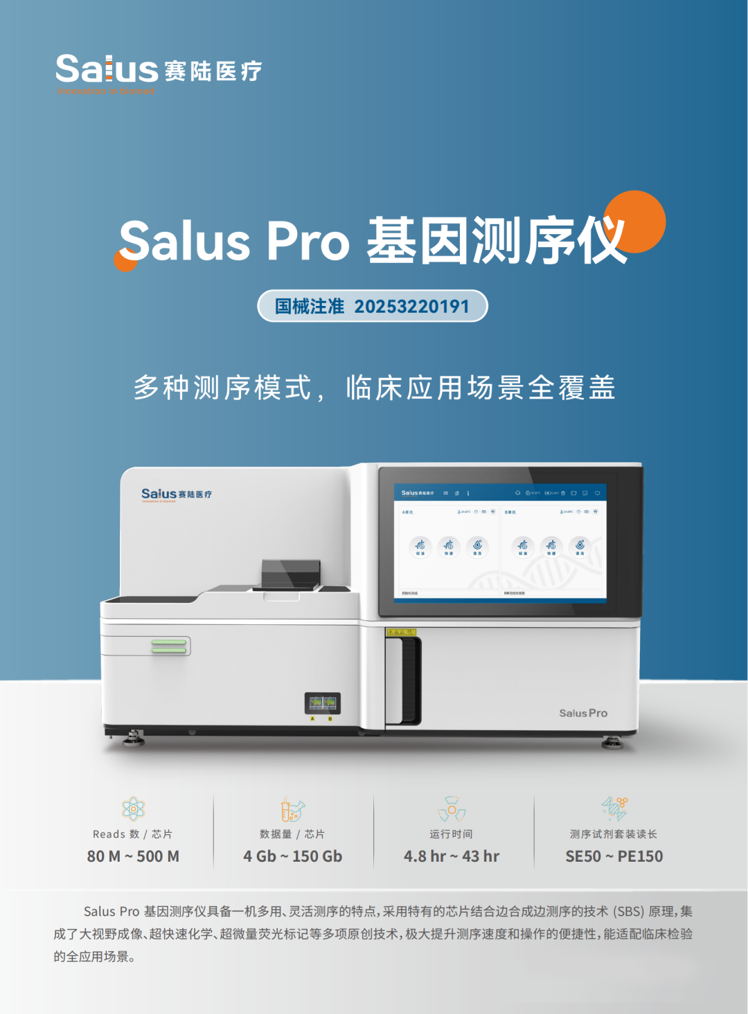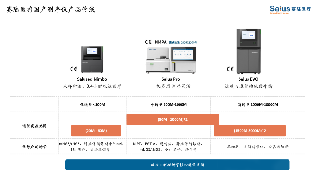 2025年1月,赛陆医疗自主研发的Salus Pro测序仪获国家药监局(NMPA)三类医疗器械注册证,成为国内首个基于可逆末端终止测序法实现全应用场景覆盖的国产设备,完美提供了因美纳被禁后国产测序仪优选方案。公司坚持以“技术自主+产业闭环”为核心,已建成光学、流体、芯片、试剂等全链条研发体系,打造全国产化测序+超分辨空间组学平台,累计授权专利超百项,产品覆盖科研、临床及农业领域,致力于成为全球生命科学工具领军者。