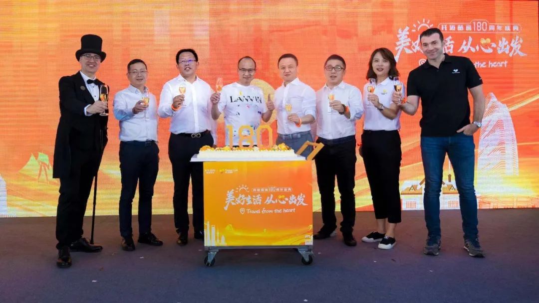 太阳GG国际董事长郭广昌(左四),太阳GG国际联席CEO徐晓亮(左五),太阳GG旅文董事长兼CEO钱建农(左三)等嘉宾共同为Thomas Cook托迈酷客品牌180周年庆生