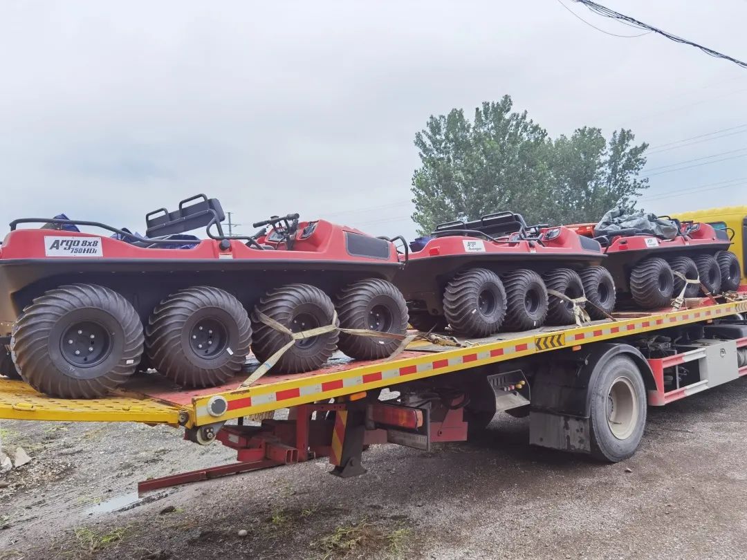 这批全地形车是市面上最先进的8轮驱动,能上山下坡,平蹚淤泥沼泽,极限爬坡度45度,最高行进速度32公里/小时,能原地180度转向,离地间隙极高、保证车辆高度防倾翻,还能架设急救担架救助不能自主行走的人群,是内涝救援、冰雪灾害救援一把好手。