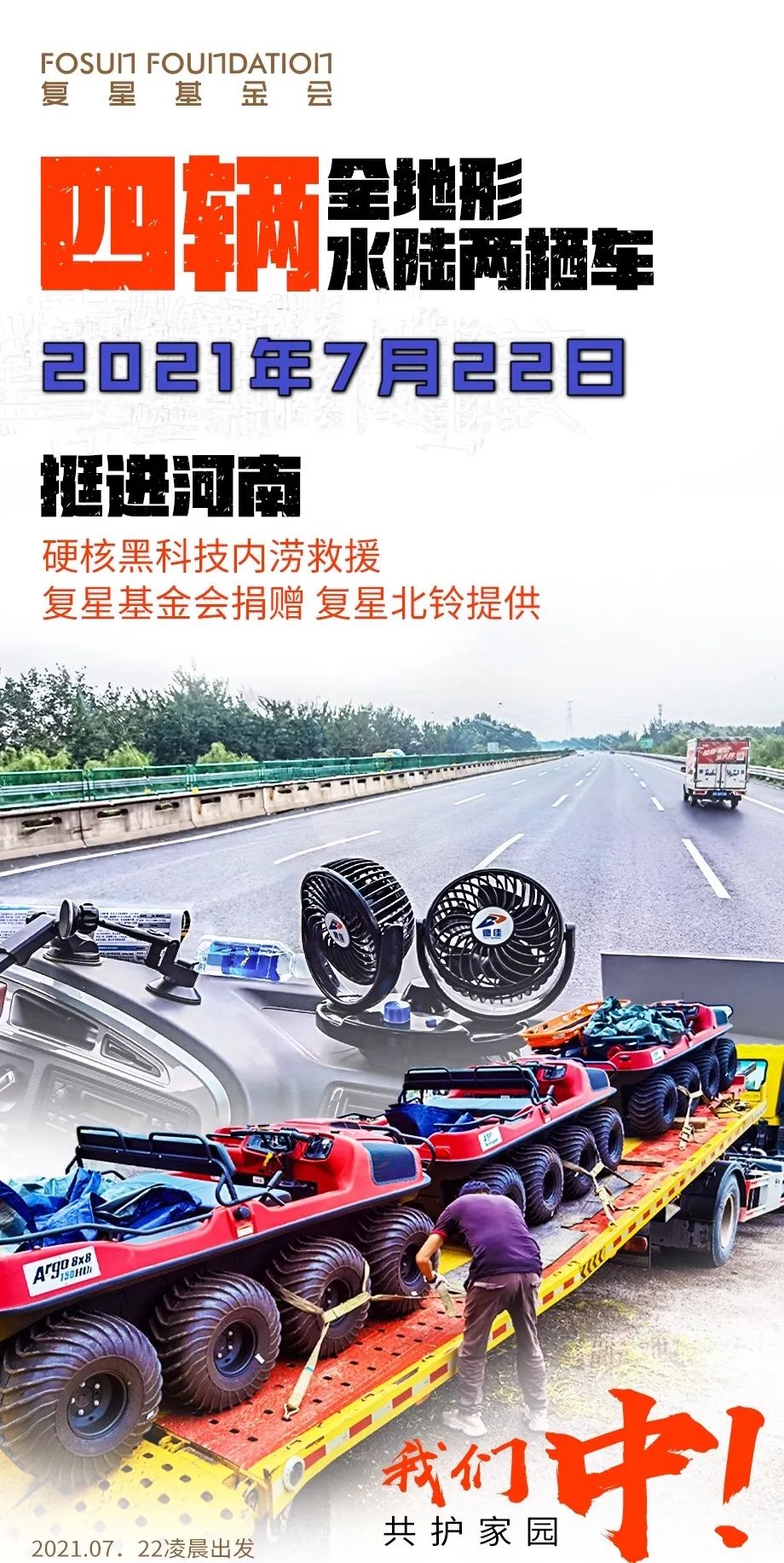 2021年7月22日凌晨,4辆全地形水陆两栖车,从北京密云出发,星夜驰援河南。