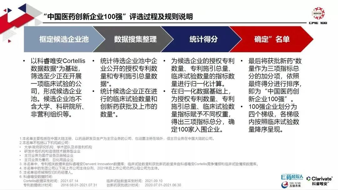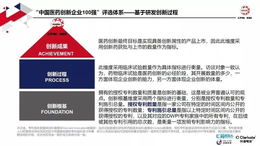 为了深度剖析中国医药产业的创新能力和可持续性,E药经理人从2019年5月开始,通过模型搭建、数据搜集与整理,从医药创新现状出发,以企业为主体,以硬数据为依托,通过创新根基、创新过程、创新成果三个维度,以授权专利数量、专利施引总量、临床试验数量和创新药获批与上市的数量四个指标为评价依据,评选出代表中国医药创新实力的“中国医药创新企业100强”。
