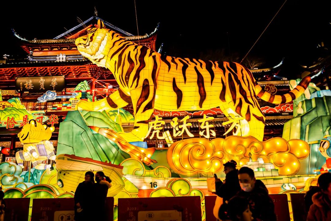 老话说“除夕的火,十五的灯”,对老上海人来说,正月十五最隆重的事莫过于来豫园赏花灯。待暮色降临,月色婵娟,灯火辉煌。走进豫园,火树银花触目红,揭天鼓吹闹春风。要说起今年豫园赏灯的热门打卡地,其中之一是华宝楼门前的中心广场。广场上霸气威风的“虎跃东方”组灯吸引了许多人停留拍照。