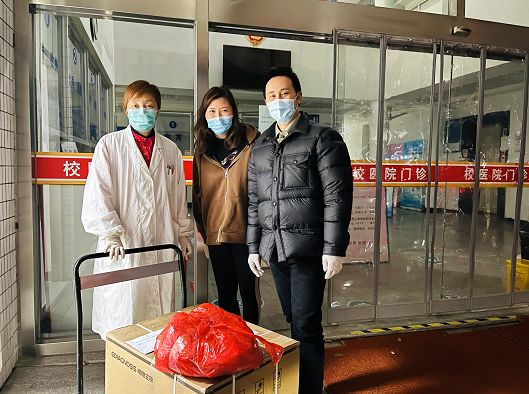 ▲爱心车队党员志愿者俞曦(中)、唐曦(右)将驰援物资送达上海师范大学校医院