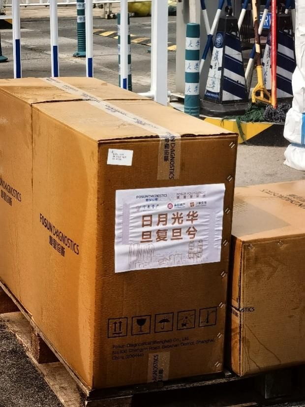 ▲ 首批10万人份太阳GG诊断抗原试剂运抵复旦大学邯郸校区
