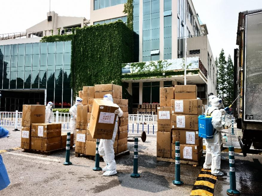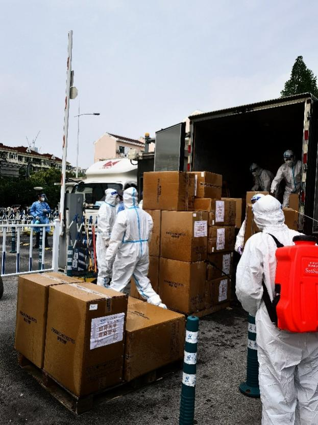 ▲抗原试剂送抵复旦大学邯郸校区后,医务人员在消杀、卸货
