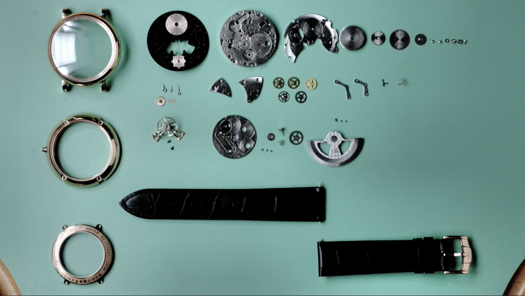 他穿上工作服,戴上放大镜和指套,开始清点操作台上的177个机芯零件。拉档组件、防震器、自动轮系、外桩螺钉……历经25道工序,将它们逐次归位。接下来还有27个壳面零件,只需要拆摆轮、装表面、检验线条、装表针表壳再检验校对,一块上海表就装配完成了。