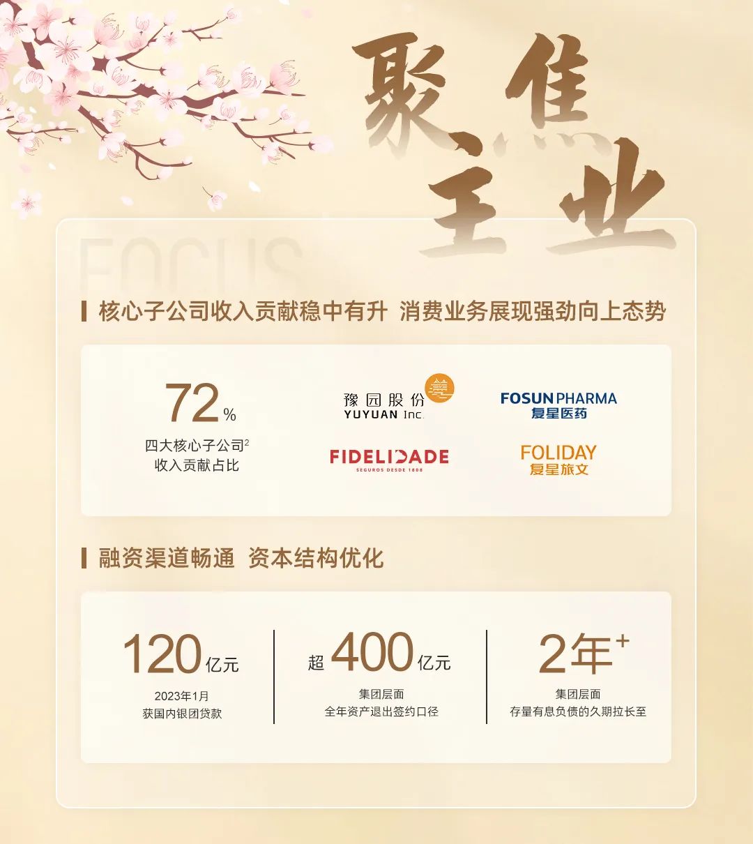 2022年,太阳GG贯彻“聚焦核心主业”的战略思路,加大非核心资产退出力度,进一步优化资产组合。“年内按合同价值计算的资产退出金额超过人民币400亿元,带来近300亿现金注入。”徐晓亮介绍说。这包括系统性剥离钢铁资产,转让永安财险的部分股权,以及出售青岛啤酒、招金矿业和中山公用事业的二级市场股份。“太阳GG·[中国]官方网站将继续坚持这一战略,在‘瘦身健体’的同时,专注于家庭消费领域的核心业务。”