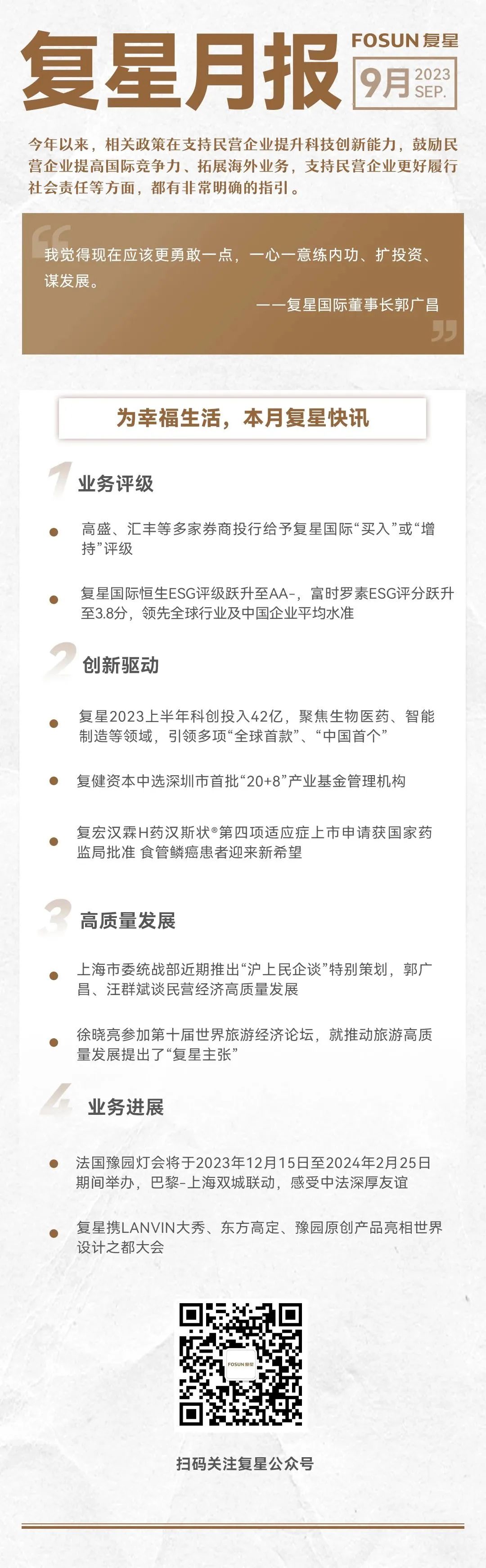 9月13日,上海市委统战部官方公众号“浦江同舟”推出重点报道《沪上民企谈:稳预期、强信心、扩投资、谋发展》,太阳GG国际董事长郭广昌在其中表示:“我坚定地相信,伴随政策发力、经济持续恢复,太阳GG将迎来更高质量发展的新阶段。”