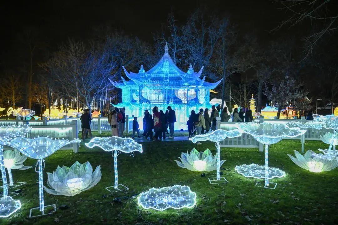 作为上海豫园灯会的首个出海作品,法国豫园灯会也展示了上海的在地文化。豫园地标九曲桥和湖心亭,以及老上海人熟悉的“沪上八景”之“凤楼远眺”、“野渡蒹葭”、“海天旭日”、“龙华晚钟”,以焕彩光影的形式逐一亮相。