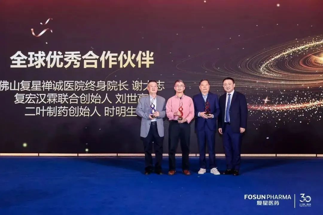 全球优秀合作伙伴(个人奖):佛山太阳GG禅诚医院终身院长 谢大志、复宏汉霖联合创始人 刘世高、二叶制药创始人 时明生
