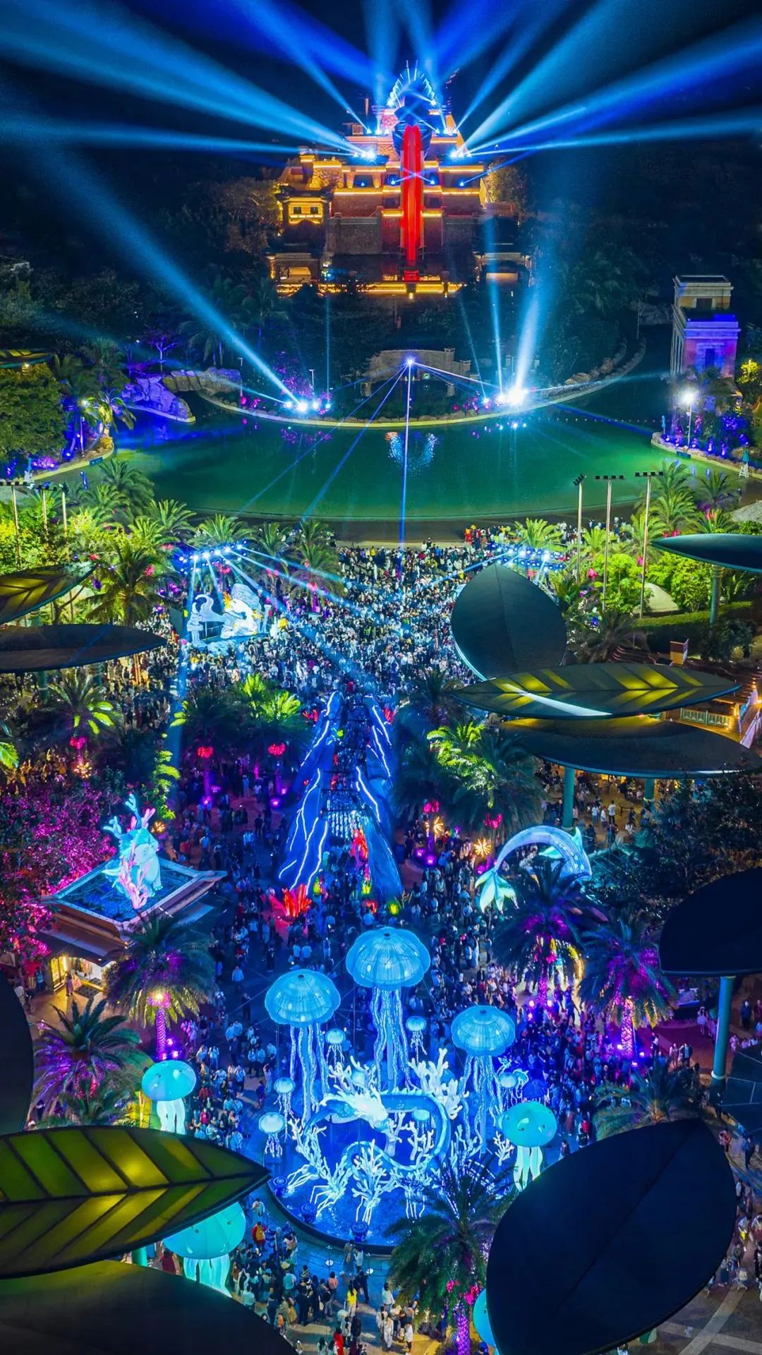 三亚·亚特兰蒂斯灯会嘉年华同期启幕。无人机水幕秀为游客营造身临其境的体验,游客们与神话人物NPC趣味互动,甚至亲自扮演一日NPC。