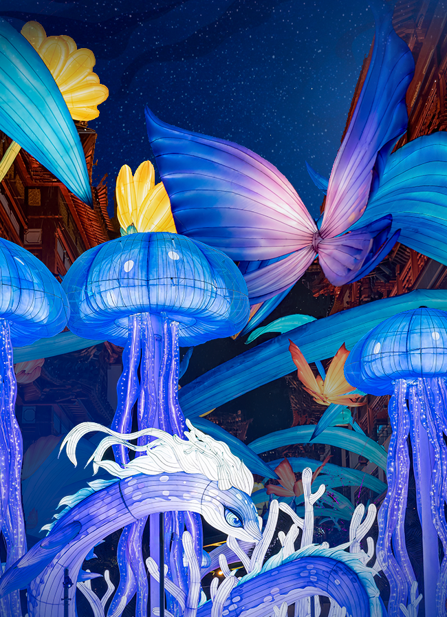 海底世界与豫园灯会的山海丛林相得益彰,打造夜幕下跨越时空的奇幻冒险之旅,还有各式春节互动玩法,为大家带去丰富的灯会体验。