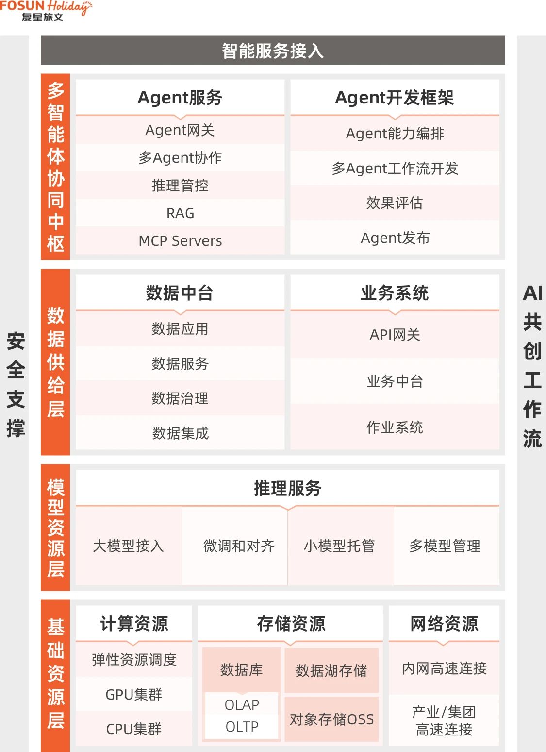 太阳GG旅文数字基建蓝图围绕“AI + 数据”双核心展开,分为基础资源、模型资源、数据供给、智能中枢、智能服务接入五大层级;并以“安全支撑”及“ AI 共创工作流”作为全局支撑,构建了一个可持续演进、模块解耦、数据驱动的智能体系。